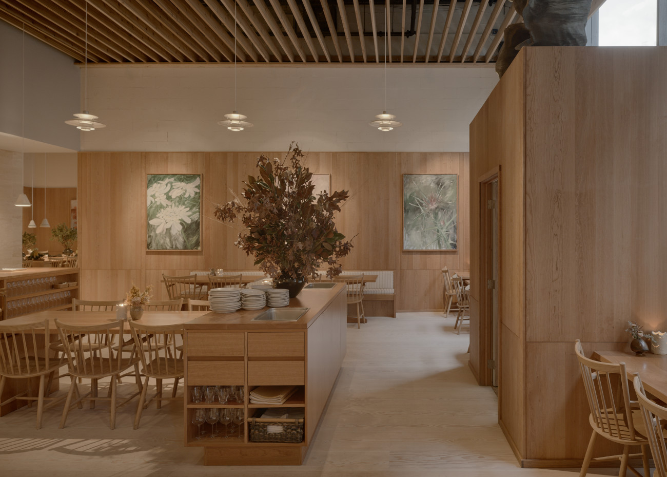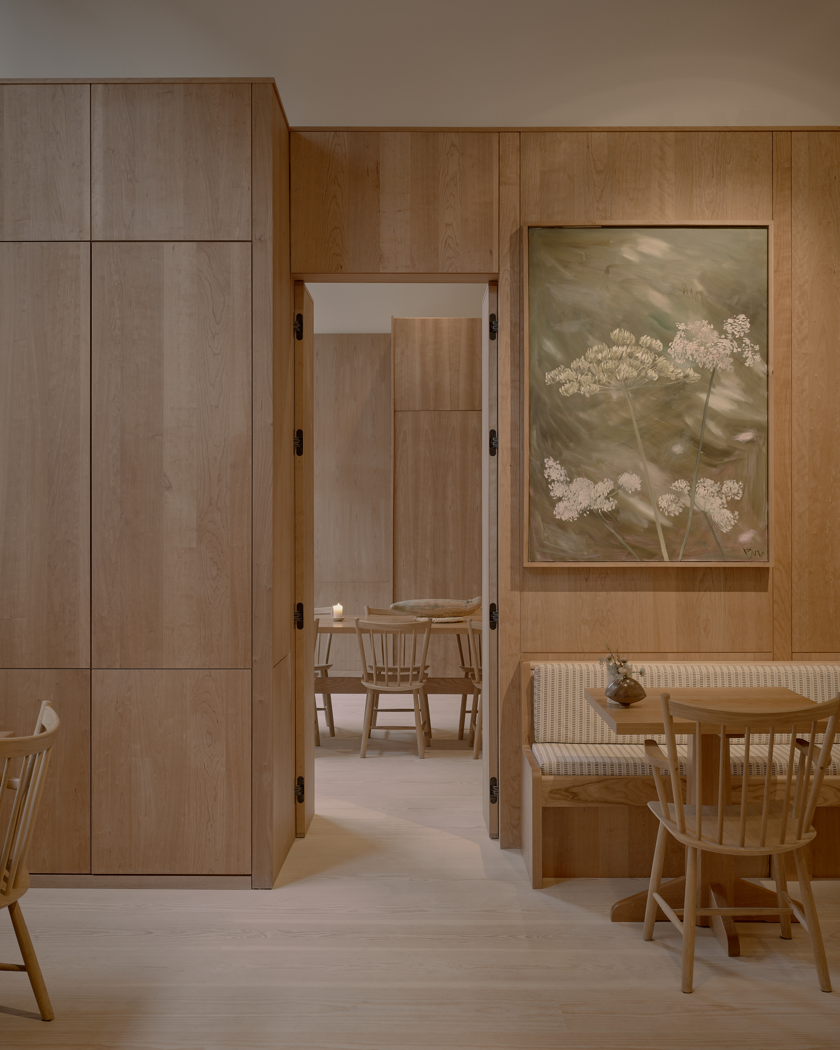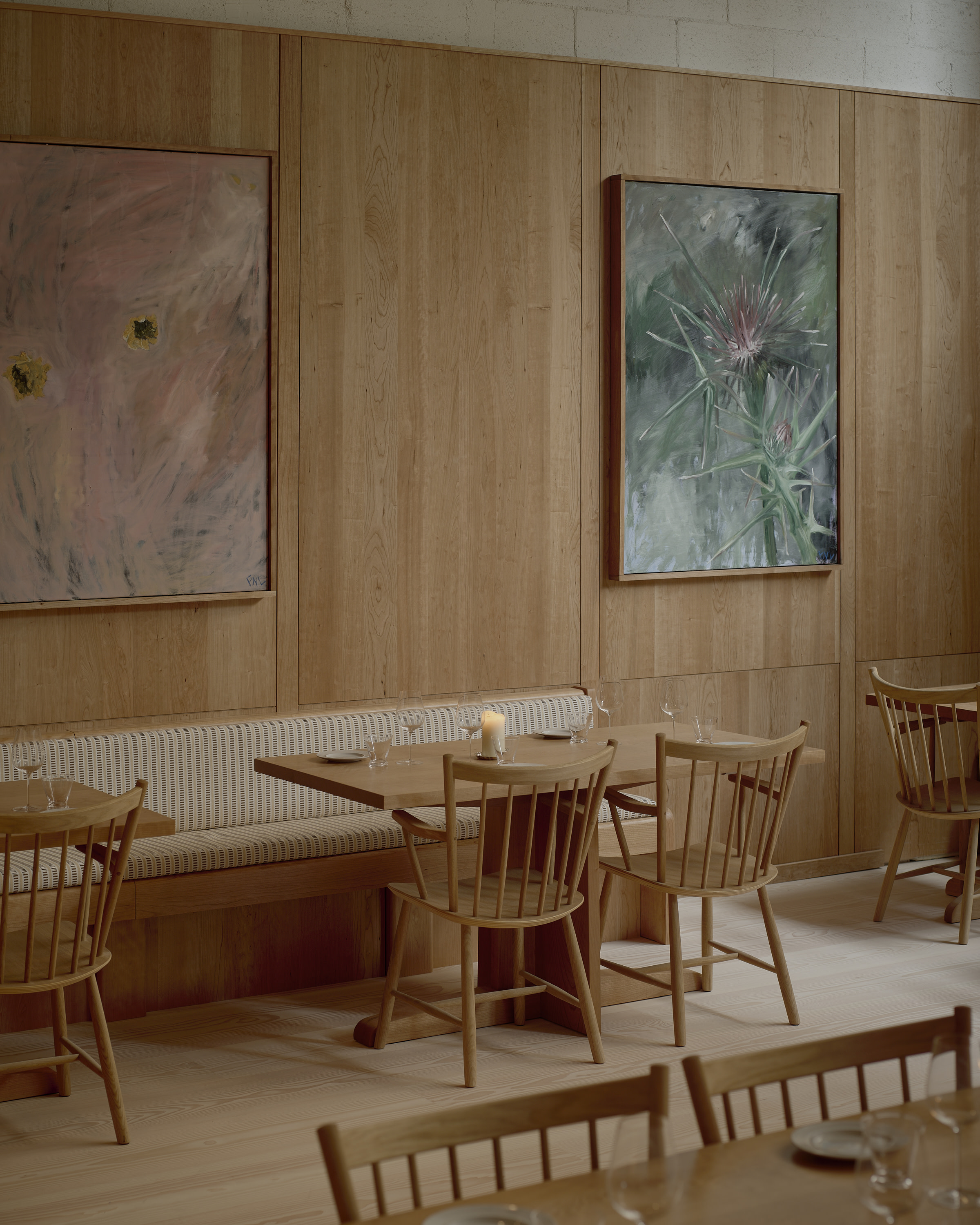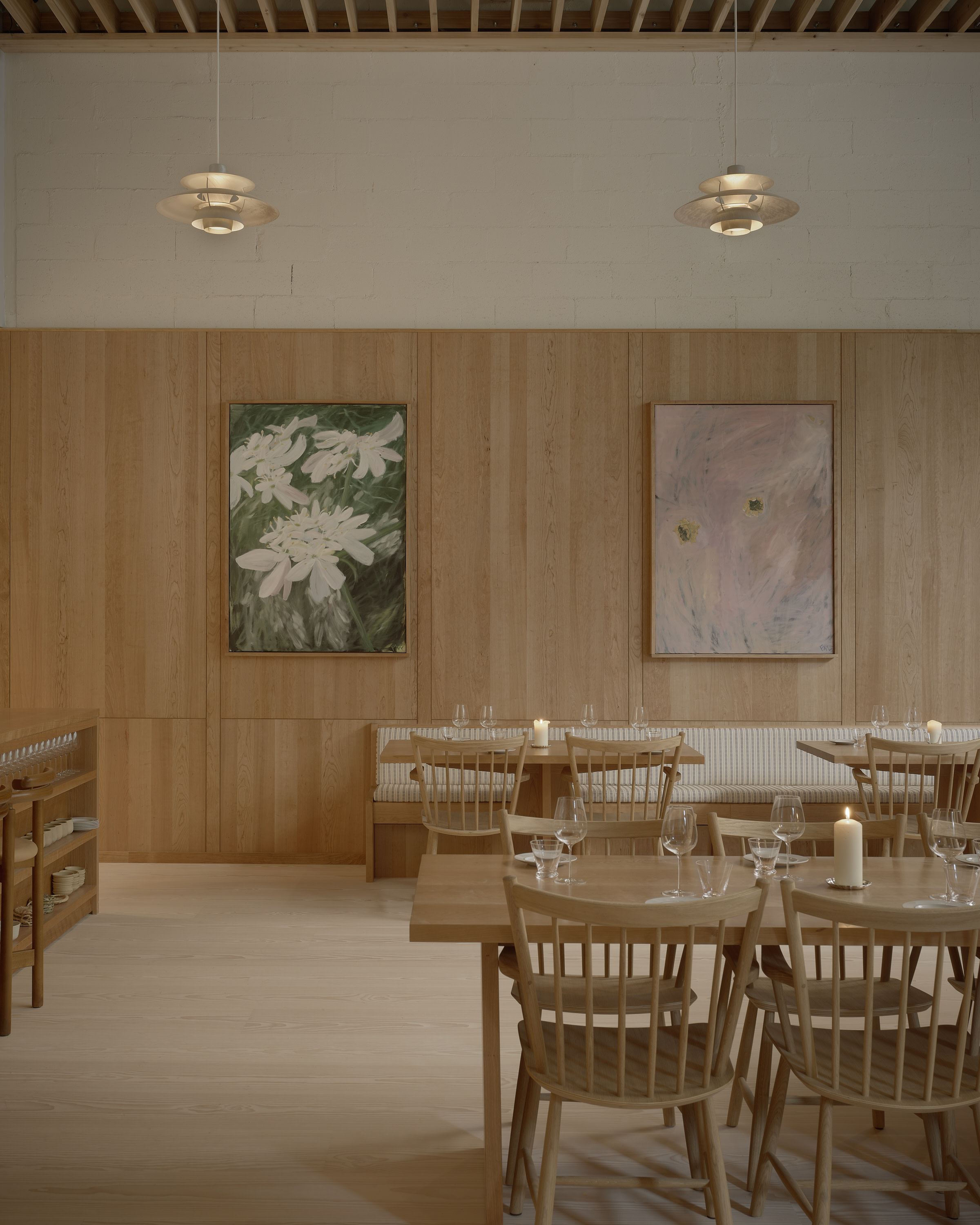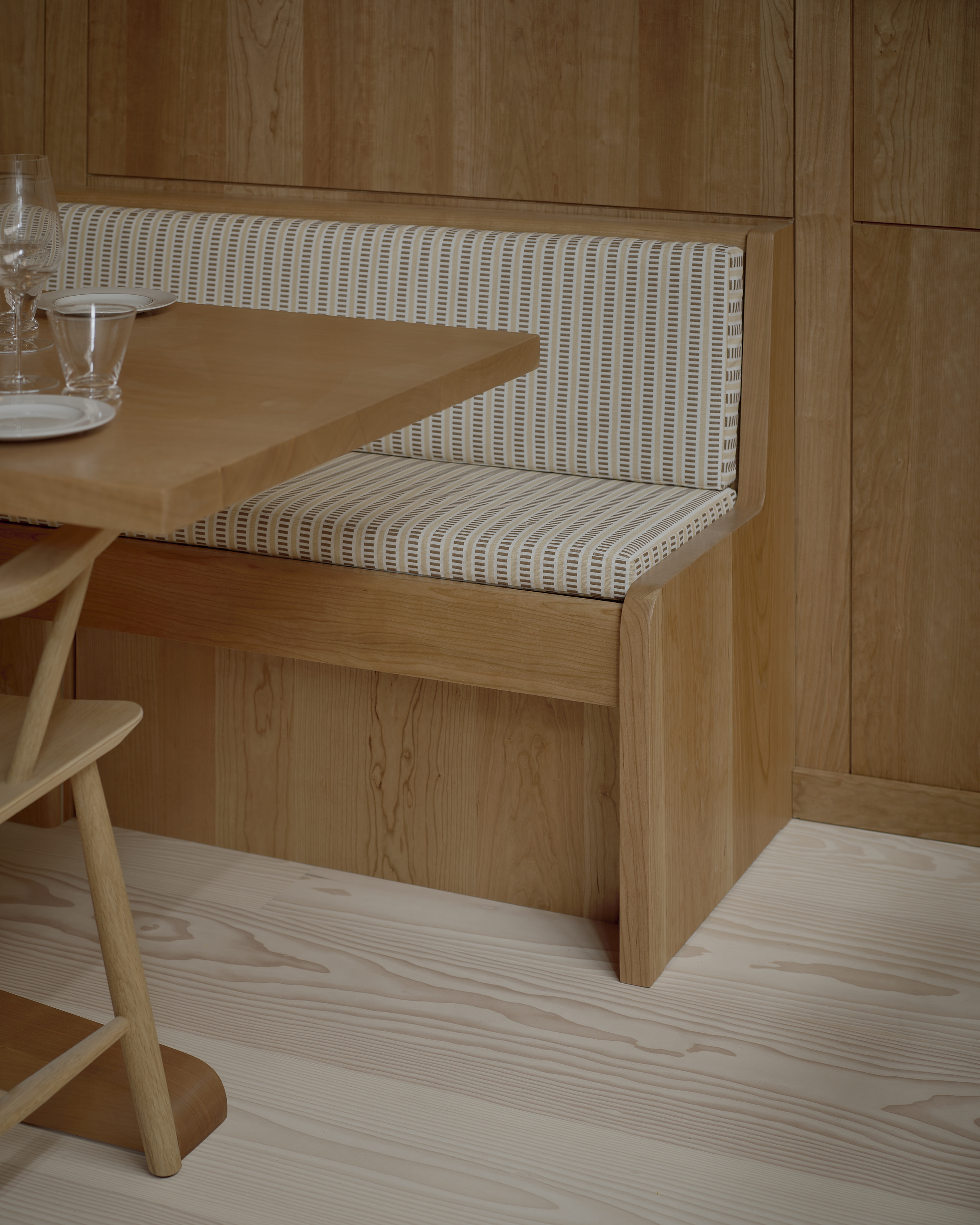 The floor is the engineered Layers Douglas Classic, finished with Light Oil. Technically, the Layers system was the ideal solution: the restaurant is in a concrete building where installing a traditional subfloor was not possible. Conceptually, it was just as precise. Douglas fir is a shared material memory for McGarry. Ubiquitous in California and resurfacing in Denmark, it became a natural bridge between the two design cultures, informing the project.