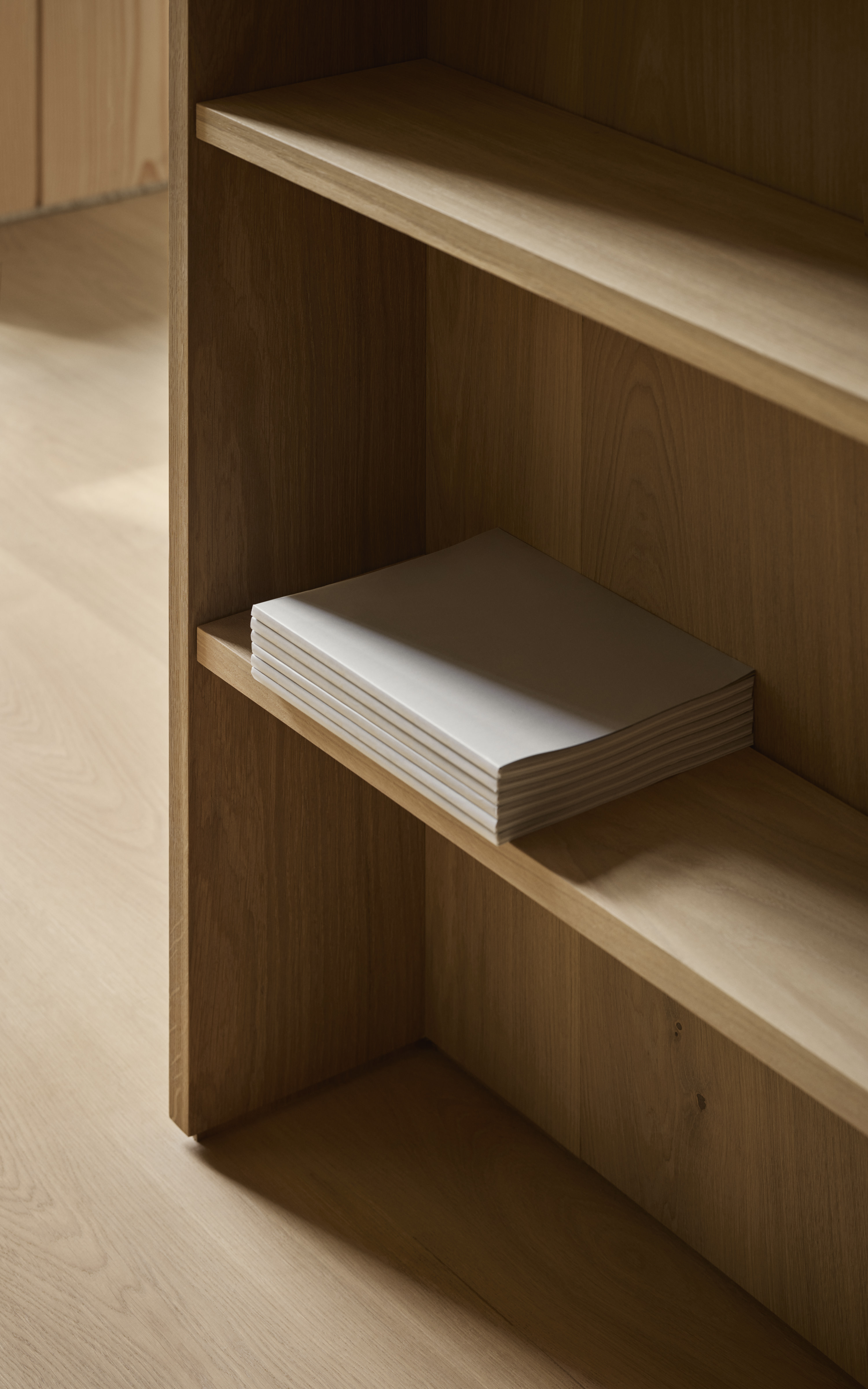 The Danish carpentry duo Ocular created the expertly crafted joinery details, ensuring a seamless flow of wood throughout the floors, walls, built-in furniture, and a custom half-turn staircase. The walls are adorned with Layers Oak that matches the width of the flooring, extending across the doors to create a harmonious transition that beautifully blends function and design. The stair treads are framed with mitered corners, and their depths are precisely aligned with the width of the wall-cladding, establishing a uniform visual language throughout the space. The half-turn staircase and wooden walls envelop you in a comforting cocoon of warmth. The finishing touches showcase a wide, solid HeartOak headboard and an impressive floor-to-ceiling bookcase in Classic Oak, blending with the room's flow and charm.