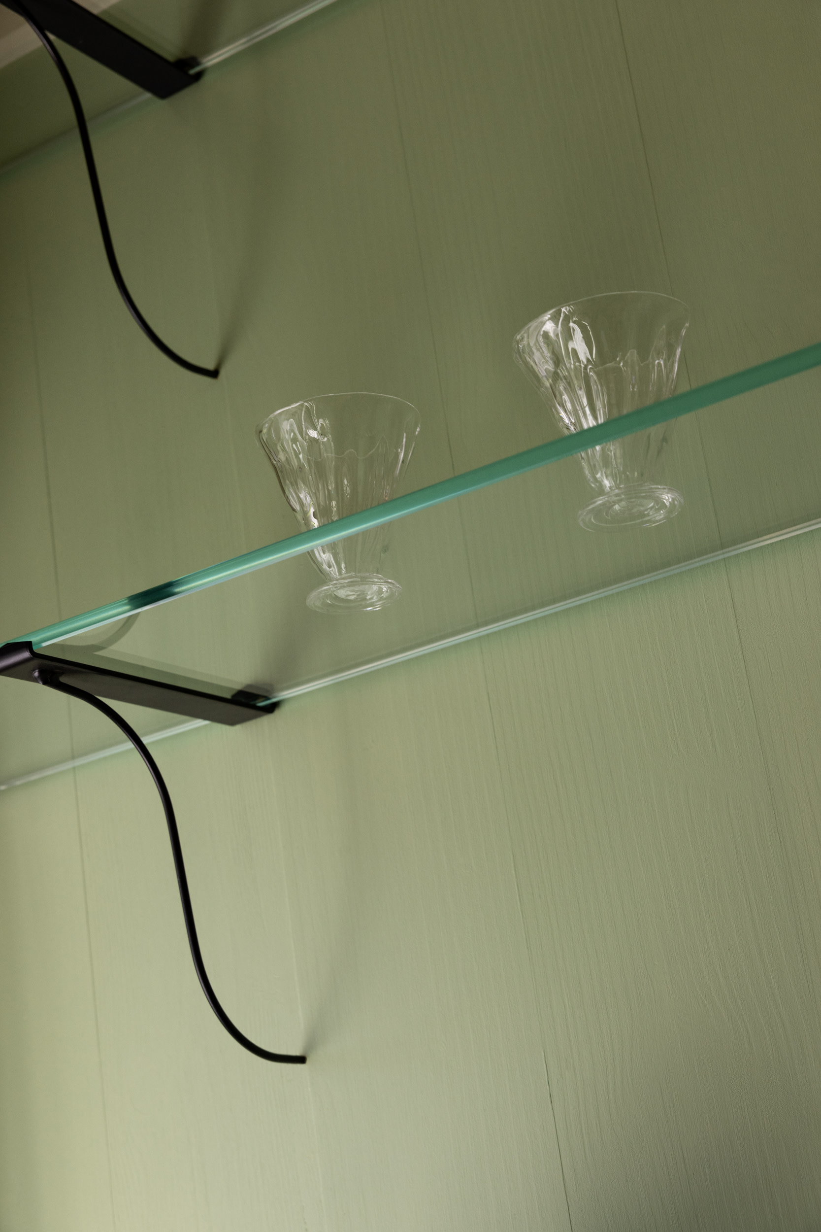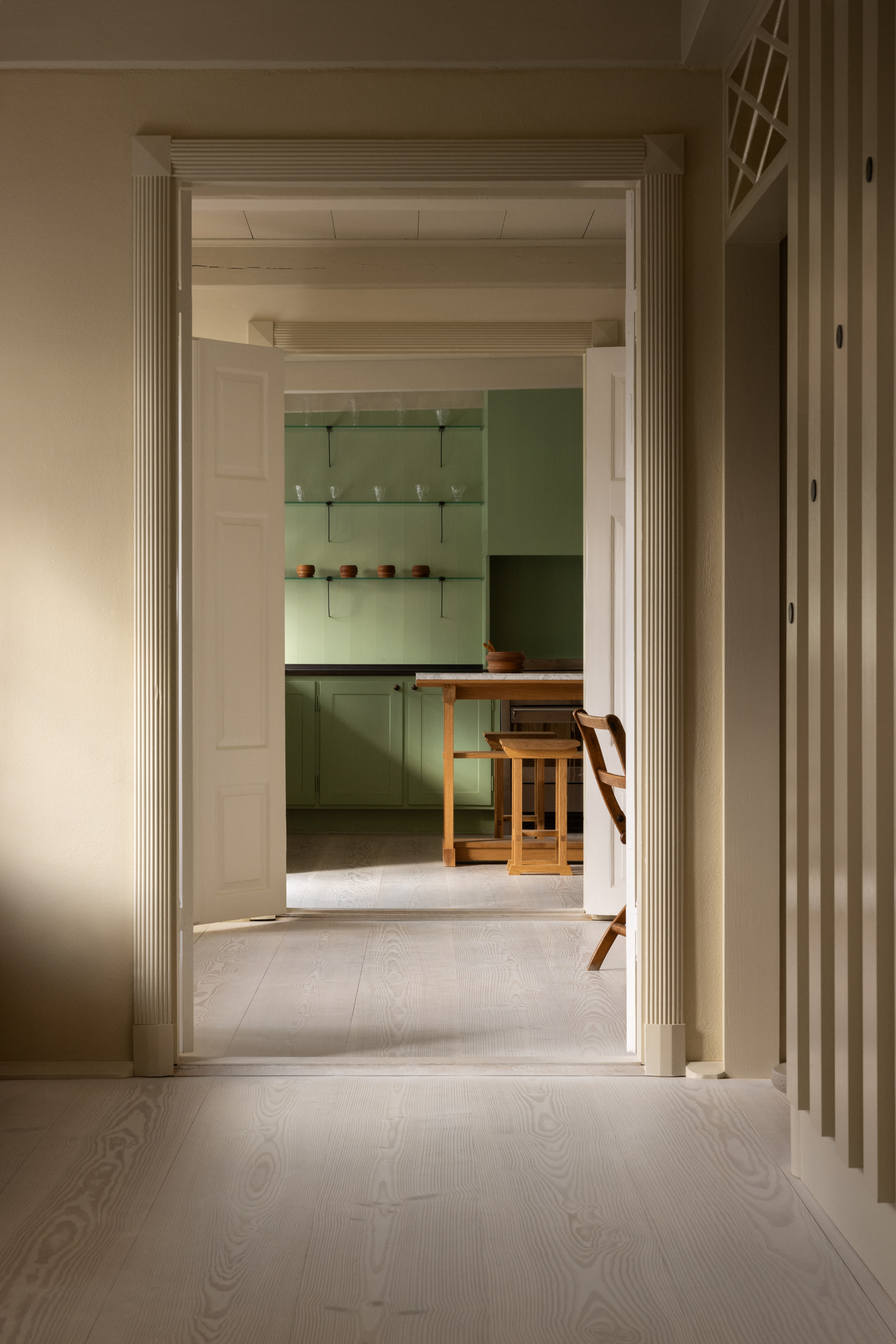 Frames from Cassetta in darker woods like walnut and pear also help provide a sense of grounding alongside the light Douglas floors, treated with lye and white soap. Hand-turned walnut and pear bowls from Georgia, designed by Peter Møller Rasmussen and Christian Vennerstrøm, further enhance the narrative of craftsmanship and collaboration. This spirit is echoed throughout the space, from the carefully curated antiques by Jamb London and glassware by Alexander Kirkeby to the contemporary design elements, creating a harmonious blend of history and modernity.