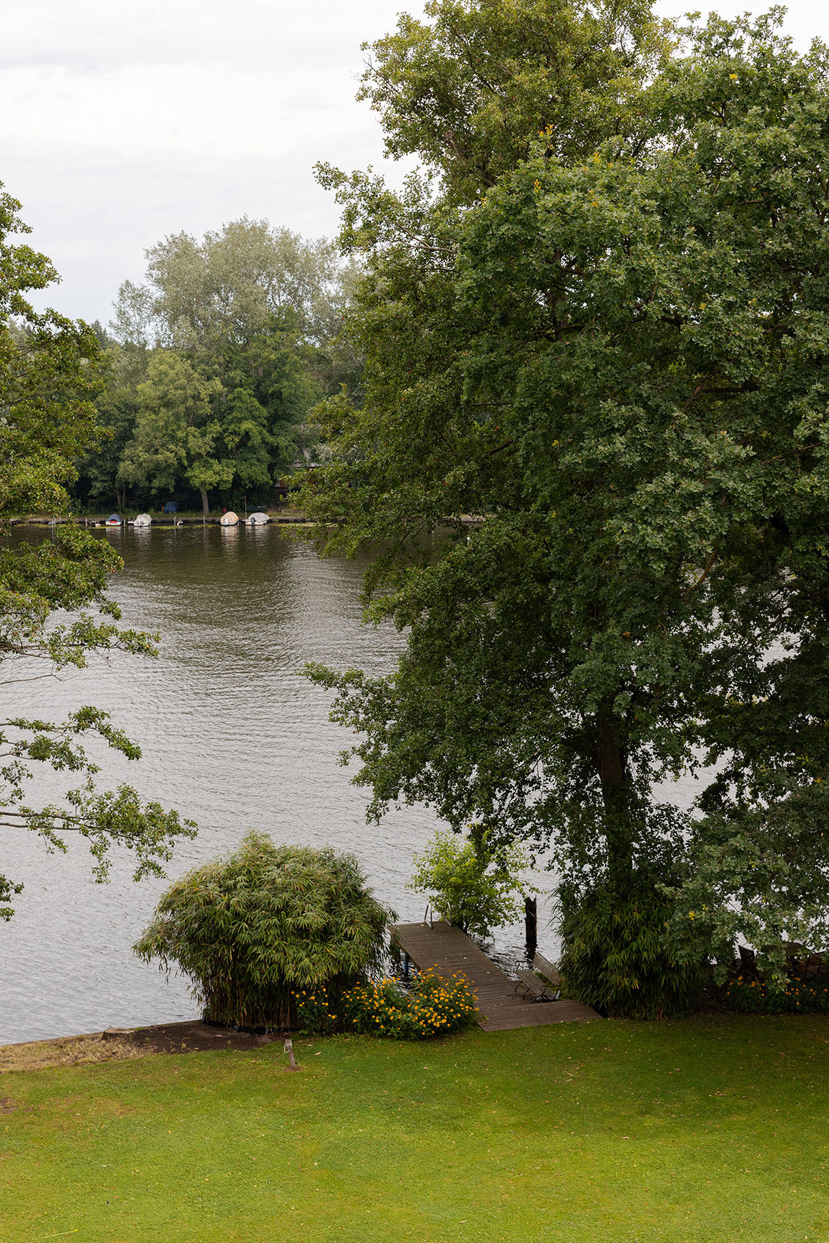 Perched above a beautiful garden upstream from the centre of Berlin, just before Köpenick, Penthouse B sits atop a historic Gründerzeit villa. Below, a private boat dock offers direct access to the world, while above, a wraparound terrace invites meditative walks among the treetops.