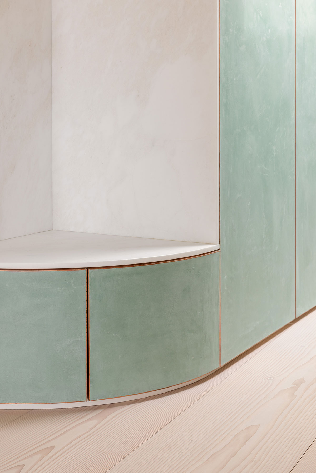 Three structures have been introduced into the open central zone, housing the utility room, guest and master showers, and a washer/dryer. The colours of the structures are inspired by the lush green of the treetops and the blue-grey of the rippling, slightly shimmering surface of the River Spree, bringing the hues of the surrounding natural elements directly into the heart of the apartment.