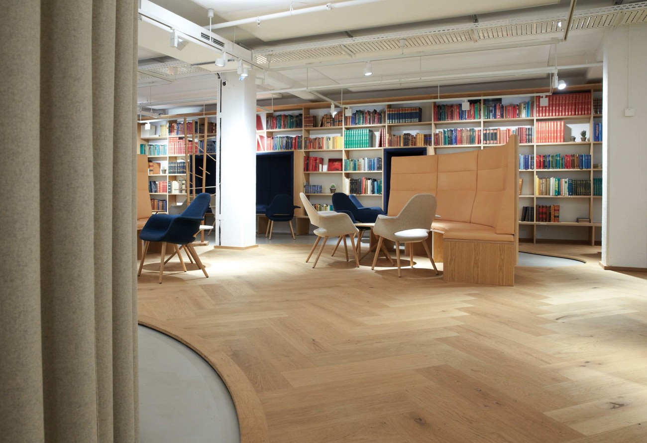 The different zones are emphasized by the remarkable floor in Dinesen Oak Pattern, laid in a classic herringbone pattern. The sweeping shape of the floor is elegantly framed by a 10-centimetre-wide curved frieze, also in Dinesen Oak. To create a living expression in the herringbone pattern, a mix consisting of 50% Oak Natural and 50% Oak Classic has been used.