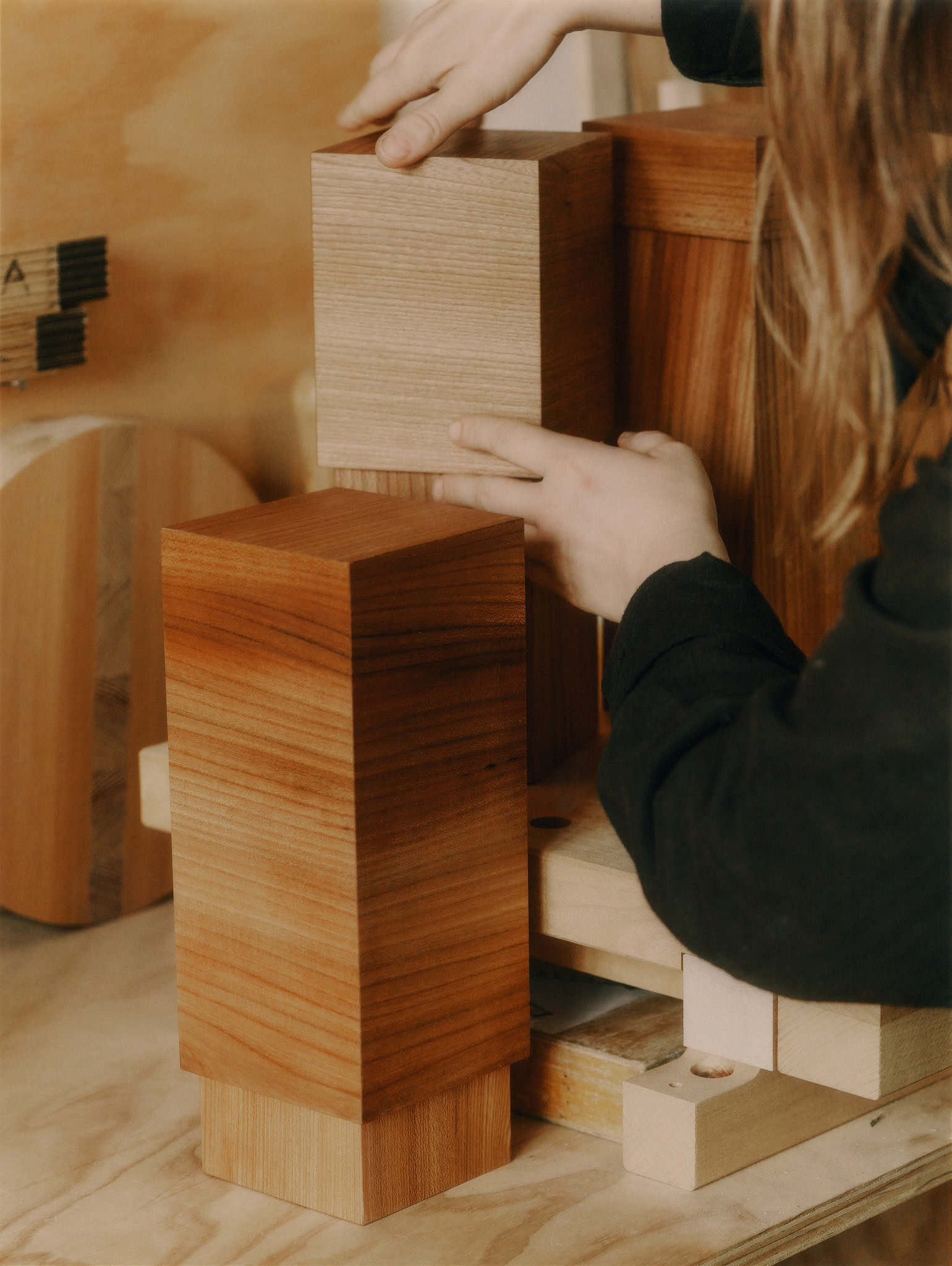 By repurposing offcuts, Søgaard allows the natural dimensions of the wood to define the framework and system of her objects. Focusing on the unique qualities of each wood type—such as grain pattern, hardness, and color tone—her designs invite personal interpretation, fostering a deeper connection between the user and the material. Through the use of leftover materials, including Dinesen offcuts, she highlights how the wood’s natural characteristics shape both the functionality and aesthetics of her work.