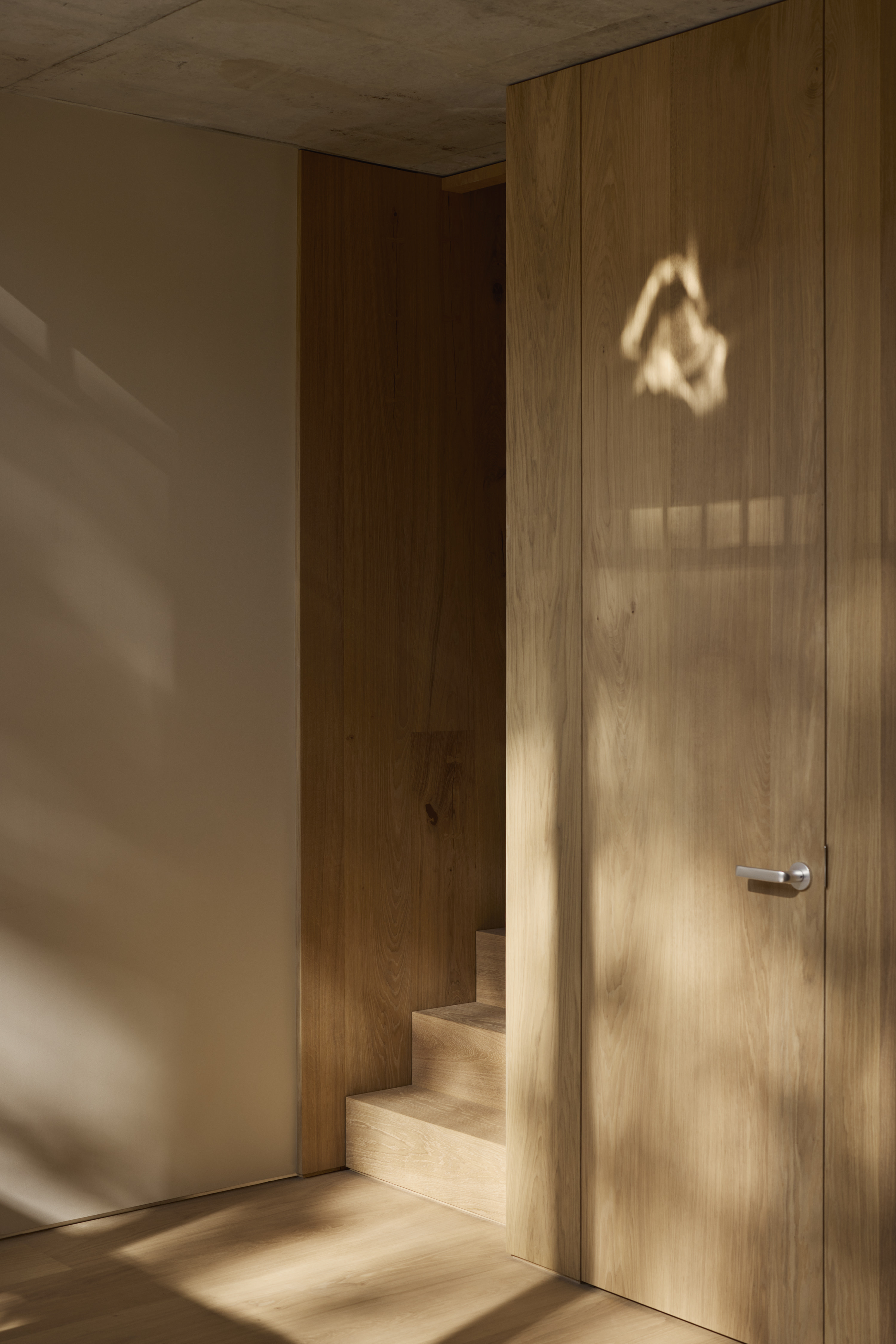Colour was developed in collaboration with Bleo, whose refined pigments enhance atmosphere without overwhelming it. Three shades—Titian, Sand and Suede—were chosen for their soft, grounding qualities. They complement the warmth of the oak while shaping light and shadow throughout the apartment.