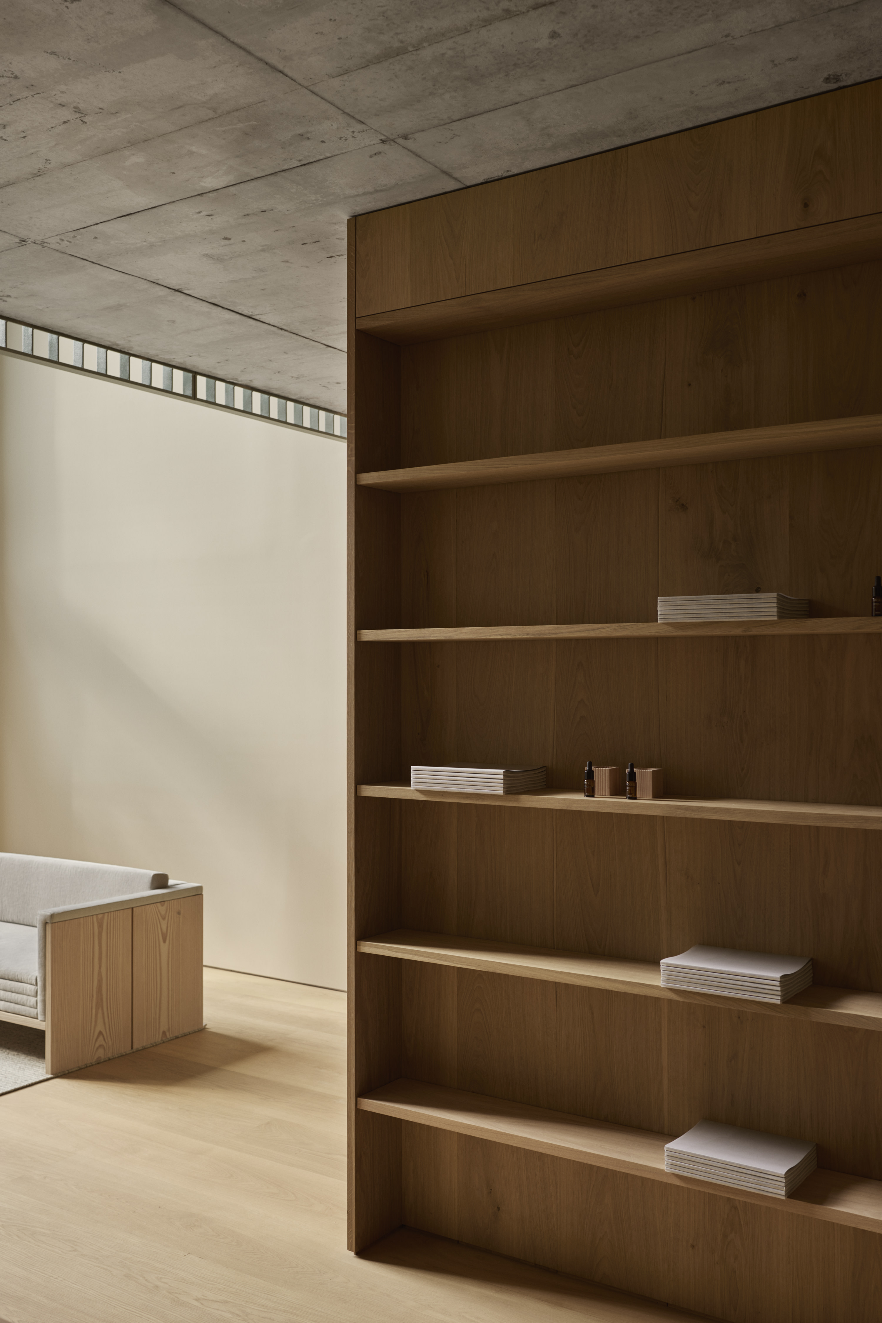 Central to the project is the integration of Dinesen Layers Oak in the Classic variant. Its refined stability enables gap-free expanses of flooring, creating a calm and elegant foundation. Floors, staircases, and wall cladding flow seamlessly, enveloping visitors in a harmonious wooden shell.