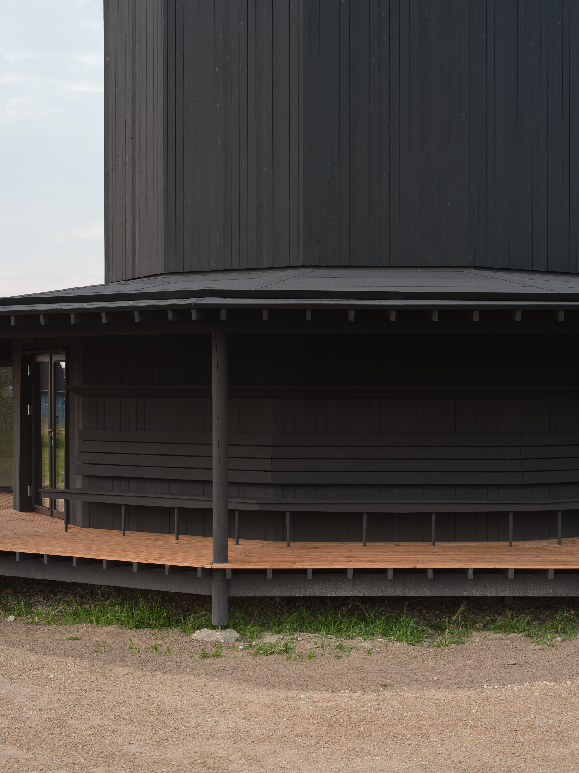 The material palette is humble yet distinctive, drawing from the site’s industrial shipyard context. Exterior timber is finished with a matte, black lime-based paint that provides both protection and gravitas in the local coastal climate. Inside, the walls are coated with earth-toned silicate paint, while the central ceiling is clad in whitewashed facade boards, identical to those used externally. The natural knots are left untreated, allowing resin to emerge over time—seen not as imperfection, but as chance encounter ornamentation.