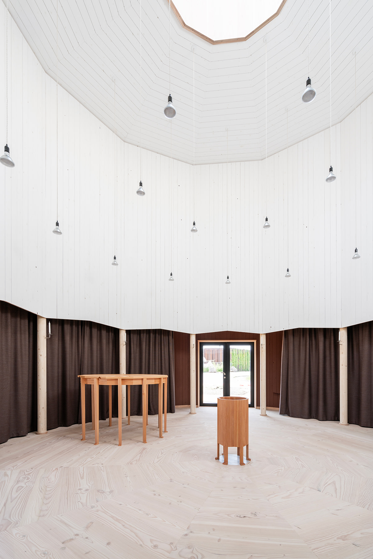 The Douglas fir extends beyond floors to bespoke furniture— including a foldable communion table and baptism font—crafted by Danish carpentry Rammelisten and designed by Julius Nielsen OFFICE.